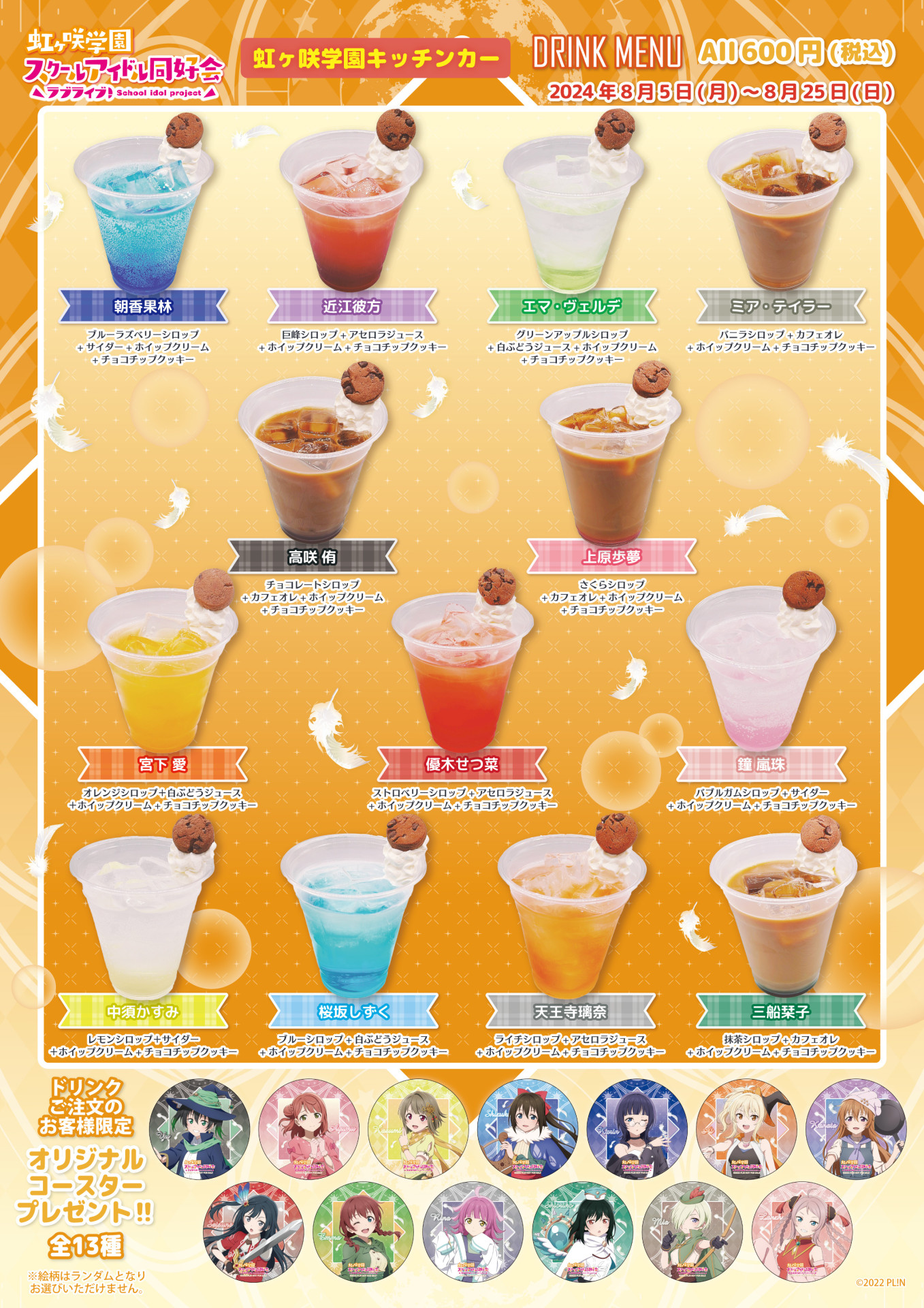 2024年8月9日(金)~2024年9月1日(日)の期間で限定ドリンクの販売、限定ドリンク購入者様への特典コースターをお渡しいたします。
