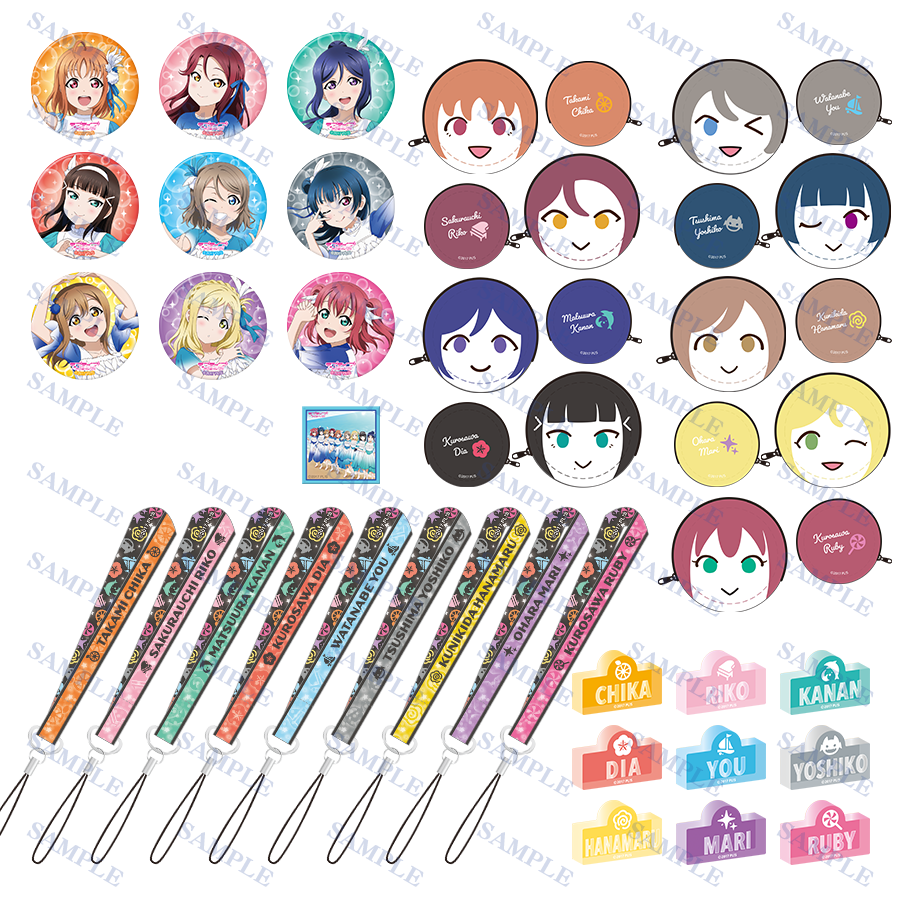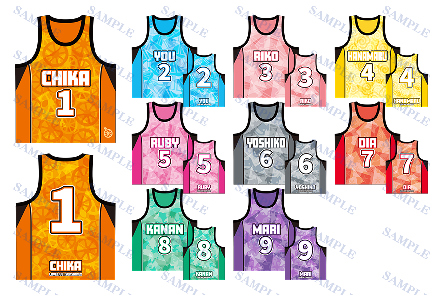 高海千歌:みかん色、桜内梨子:サクラピンク、松浦果南:エメラルドグリーン、黒澤ダイヤ:レッド、渡辺曜:ライトブルー、津島善子:ホワイト、国木田花丸:イエロー、小原鞠莉:ヴァイオレット、黒澤ルビィ:ピンク